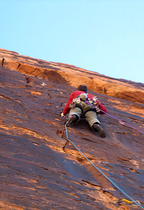 Mike Anderson лидирует на Black Pitch (5.11, седьмой питч) на Shake That Bear (5.12d R), Mt. Kinesava, Национальный Парк Zion. Фото Rob Pizem. |