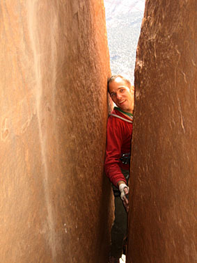 Mike Anderson рядом с базой в конце восьмого питча 5.12 на Shake That Bear. Rob Pizem: “Я только что закончил лидирование по 50-60-футовой трещине на шесть дюймов с небольшим. Меня тошнило и хотелось плакать.” Фото Rob Pizem. |