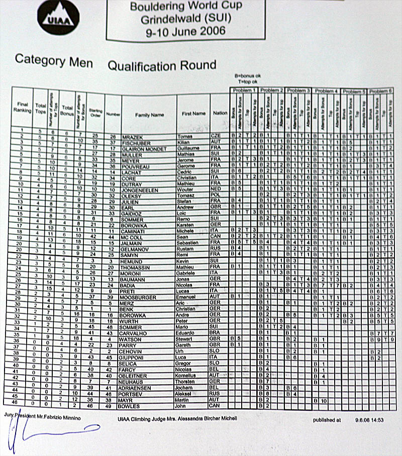 Проблемы были очень высокого уровня, халявы не было, 2-е трассы были старт на одном грибе финиш на другом, мизерки и пассивы. Первым попал Мразек, вторым Фишхубер, третьим Глайрон Мондет и Мюллер. Рустам попал последним в 20-ку вместе с Samyn Remi (Самин Реми). Девушки стартуют только в 16:00, а наши лезут в 18:00.