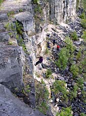 Проснувшись в девять, после шестичасового сна… сегодня не бегать… накрапывал мелкий дождик, но всё-таки решили немного полазать перед отъездом. Повесили верхнюю, простегнув верёвку в стационарный верхний карабин (не муфтованный). По ходу дела ещё подумал что так вроде не делают… Сеня как всегда проходит ровно по трассе (благодаря росту), я долезаю до ключа и решаю обойти справа, долезаю доверху, из-за сильного маятника повисать не хочется и я вылезаю наверх, встаю на краю, дергаю верёвку…. щёлк… верёвка от меня идет к Мише, никуда не простегнутая… одно мгновение – в голове ни одной мысли, потом вешаю на цепь свой карабин, замуфтовываю и продеваю верёвку, спускаться по ней почему-то не хочется, обхожу по тропинке, только дойдя до низу понимаю, что так тоже не делают. Лезет Таня – поэтому молчу. Сеня – следующий – простегивает карабин в колечко. Дождь идет сильнее, Коля тоже проходит ключ, я вишу там минут десять – но безрезультатно – хоть стою на мысочках – не хватает 2-3 см… на предложение снизу – «а ты прыгни!» отвечаю в духе: страх высоты – вчерашний спирт – да я вообще-то турист-лыжник-химик, лазать не умею… надо куда-то ноги подставлять, от тоски долезаю до этого места с нижней. Погода намекает, что пора сворачиваться.