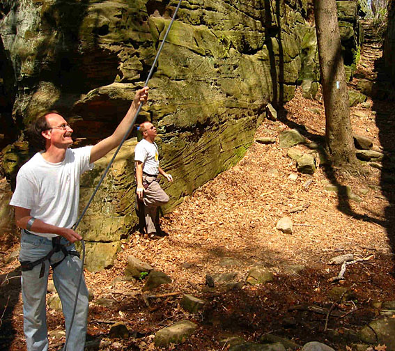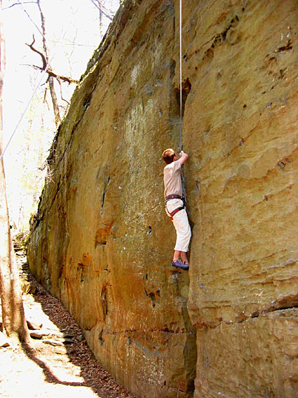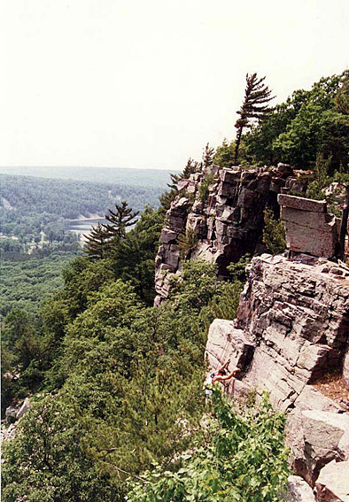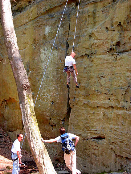 В Мамин День (Mother’s Day), 8 Мая, мы с Даником (6 лет), Алиской (2 годика) и нашими знакомыми Мишей, Ирой и их девочкой Тали поехали на озеро Хинкли просто погулять под скалами и иметь там пикник. Прогулялись. Даник ныл, Алиса хотела на ручки. Вдруг я заметил на скале знакомую фигуру. Мой первый инструктор по скалолазанию Милт сидел верхом на нависающем дереве и привязывал к нему стропы.