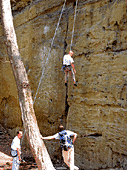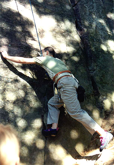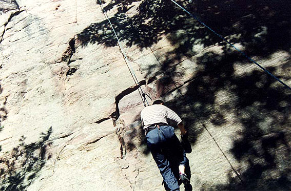 Брайан действительно уже в расстройстве лез на стенку без веревки. Я предложил свои услуги. Он полез ту же 5.9, что и я. Получалось у него несомненно лучше. Сразу чувствовался десятилетний опыт. Потом он упал. Потом сказал, что зацепки слишком маленькие. Потом снова упал. Потом сказал, что дальше не полезет и хочет вниз. У меня отлегло. Ну, хоть не один я не смог это пройти. Каким я все-таки завистливым и самолюбивым скалолазом сделался!