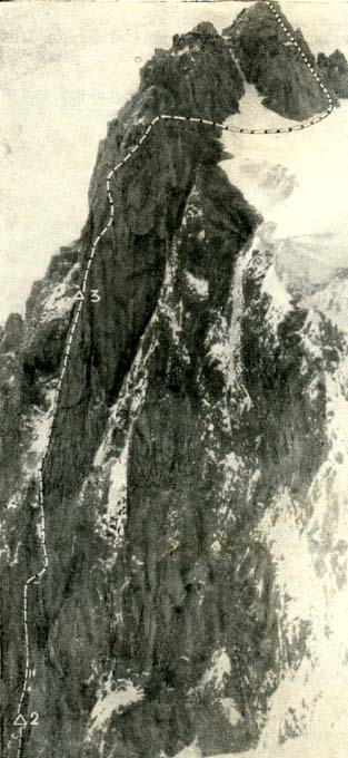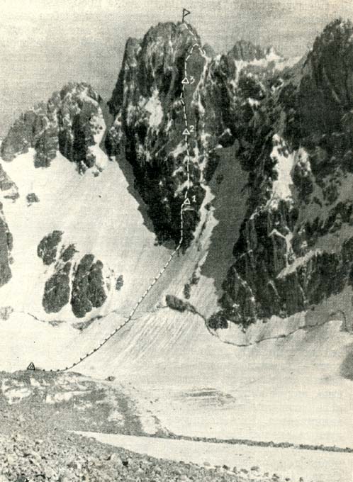 на 30-40 м над ледником, через предвершину; второй - по леднику Корона,
