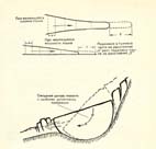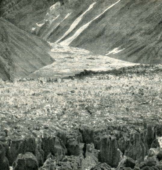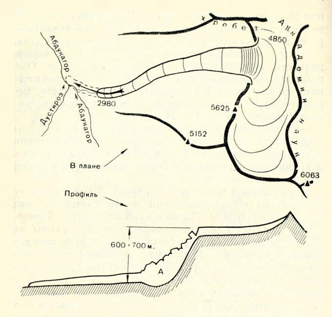От обширной и пологой фирновой области к языку Медвежьего ведет гигантский очень крутой ледопад высотой 600—700 м. Дальше вниз спускается 7-километровый язык с пологим залеганием (см. схемы на стр. 182). Колоссальная ступень ледопада разделяет две довольно спокойные (верхнюю и нижнюю) части ледника, находящиеся в различных температурных условиях. Следствие подобного «устройства» ледника — огромное скопление льда в нижней части ледопада, в тылу языка («А»). Именно эта часть ледника имеет наибольшую мощность и подпружена очень пологим языком в суживающемся ущелье, а также порогом в тылу языка.