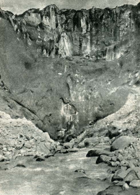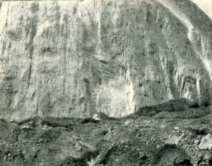 ...Осенью нам вновь удалось побывать на Медвежьем, пройти по сильно изменившейся, еще изорванной поверхности от языка до бывшего озера, подняться к ледопаду по левому борту. Со дна бывшего озера мы увидели огромную, черную от моренных включений отвесную ледяную стену плотины высотой более 100 м. Мы осмотрели район и с самолета, детально обследовали Медвежий и ледник Академии наук с вертолета.