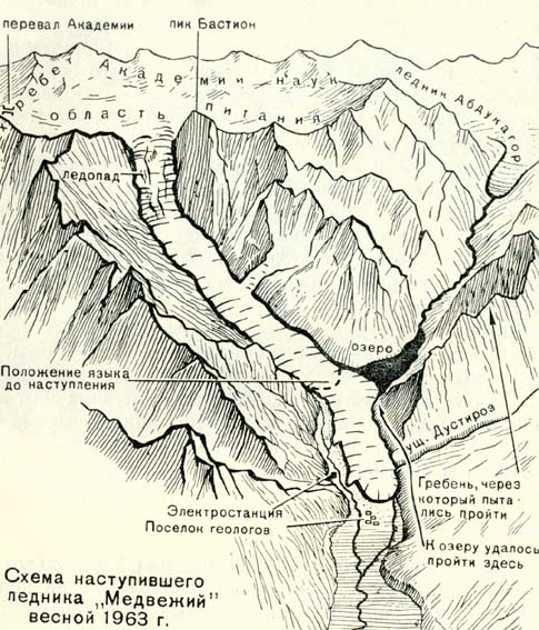 В Ежегоднике советского альпинизма «Побежденные вершины» за 1954—1957 гг. в схеме к статье Е. А. Казаковой и С. М. Лукомского «К истокам ледника Федченко» показана ледниковая ситуация, аналогичная теперешней. Язык Медвежьего выдвинут далеко вперед, перекрывая устья Абдукагора и Дустироза. В статье указано: «Между 1949 и 1955 годами произошло резкое наступление ледника». Там же: «Тропа уперлась в грязные льды ледника Медвежьего, перегородившего всю долину Абдукагора. Пересекая ледник, мы должны были с полкилометра двигаться в ледяном лабиринте». Речь, видимо, идет о подвижке ледника, датируемой Р. Д. Забировым 1951 г.: ни самому Забирову, ни кому- либо другому не удалось тогда наблюдать ее в «натуре», подвижка установлена постфактум и принята за случайную. При посещении района группой Лукомского еще сохранились ясные следы наступления, хотя обтаявший язык ледника был уже вполне проходим.