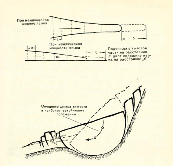 На ускорение движения ледника наиболее сильно воздействовало, видимо, поведение мощного линзообразного тела «А». При достижении линзой критической величины за счет поступления материала сверху через ледопад происходит ее резкая подвижка, возникает волна вздутия и затем сильно выдвигается язык. Подвижке линзы механически способствует и то, что ее центр тяжести стремится занять наиболее низкое положение.