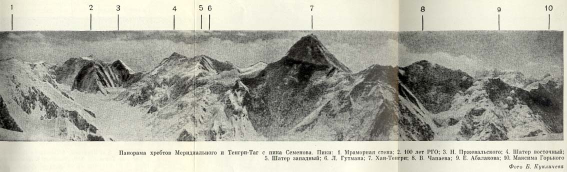 хребтов Меридиального и Тергри-Таг с пика Семенова. Пики: 1. Мраморная