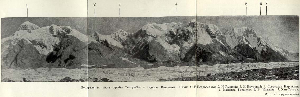 часть хребта Тенгри-Таг с ледника Иныльчек. Пики: 1. Г. Петровского, 2.