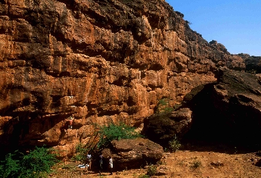 Ganesh Plateau Area, Badami. Скалолаз слева лезет по маршруту Fire or Retire, 7a, а скалолаз далеко справа по French Disaster, 6c |