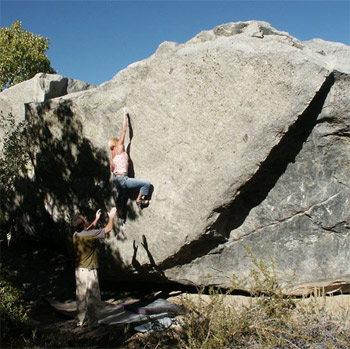 Слева от Buttermilk Stem вертикальная шершавая стена, начинающаяся с прыжка на дырку, а затем длинные перехваты влево между колючими мизерами, которые проверили на стойкость каждого из нас, даже у лазающего V10 Tim'а были сложности. Sarah пробежала её несмотря на то, что только что пришла с затянувшейся до утра вечеринки в баре Whiskey Creek. Brian “Bone Daddy” Khul, учитель, прошёл её после нескольких попыток, так же как и учительница Krista, мать Brody, который в тот день сидел дома, под папиным надзором. Категория? Понятия не имею, наверное V4 или 5. Что-то вроде того. Меня никогда особенно не волновало, насколько трудной считает проблему автор гайдбука. Tim оптимистично предложил соединить сидячий старт Buttermilk stem с этим безымянным болдерингом. Но кончики наших пальцев были уже стёрты до мяса и наши бицепсы сгорели дотла. Может мы бы и хотели, но это было совсем другое блюдо, более подходящее для Sharma чем для компании занятых, хотя и увлечённых, любителей скалолазания. Вы знаете, что обычно происходит дальше? Ну, вы пробуете, вполсилы, вы неизбежно отваливаетесь, с вас хватит, уже время уходить, пойти попить пивка и обсудить смысл жизни, созерцая как высотный ветер сдувает снег с хребта в 10,000ft над вами. Ну да, примерно так и оно и могло быть, но получилось иначе. Sarah Schneider немного постояла, извлекая подсказки из наших повторяющихся неудачных попыток, и с концентрацией, достойной мастера боевых искусств, пролезла болдеринг - то что все мы не смогли сделать. Конечно же, смысла жизни мы не открыли, но пиво, как обычно, было неплохое, и Sarah получила дополнительную порцию.