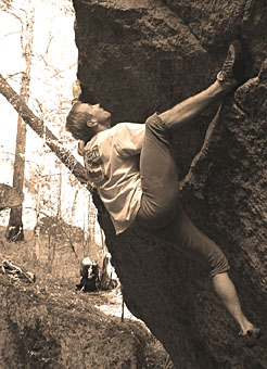 Мой первый опыт лазания без страховки был получен на Красноярских Столбах. Тогда мы, крутые перцы, впервые выехали на соревнования. Прошло все как положено - облажались по полной. Первым видом была представлена скорость. Её проводили на гостинице «Турист». Зацепы были накручены прямо по стене здания, а стартовая площадка была оборудована на уровне пятого этажа со специально сделанного деревянного настила. Полный надежд, я вышел на старт и пролез по одной трассе аж 3 метра, а по другой - 2. Но чтобы вы не подумали, что наш тренер Афонин Александр Анатольевич привёз на соревнования полных дундуков, надо сказать: обе трассы тогда пролезли только двое, остальные разложились по высоте.