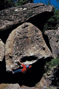 Да, я пролез версию со стартом сидя в Сентябре 2003 года еще до того, как обломилась зацепа. То, что сначала было слопером с маленьким «завитком » (помогавшим держаться – прим. перев.), теперь стало просто слопером. Но это не сильно меняет сложность, будучи первым движением в версии со стартом сидя, особенно, если вы любите слопера. Но если вы стартуете с самого низа валуна, то есть идете Tonino 78, то это сильно увеличивает сложность, ведь прежде, чем добраться до (сломанного – прим. перев.) слопера, вам необходимо сделать серию трудных напряженных перехватов.