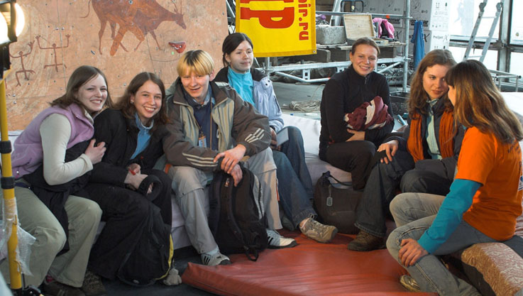 После женских финалов, за час до мужских я (С) с Ярославом (Я) взяли интервью у двух сестер: Марины (М) и Олеси (О), которое и предлагаю вашему вниманию. Каюсь, я к нему не готовился, и получилось бы совсем все плохо, если бы не Ярослав, который не давал мне скатиться в обычный треп и возвращал к скалолазной теме разговора, задавал вопросы по существу. Особенно всем понравился вопрос о лазанье соло.