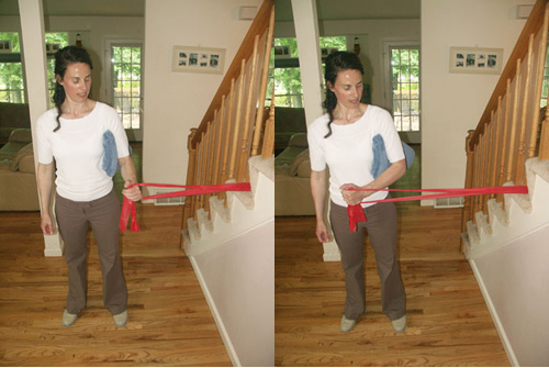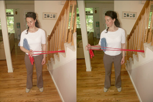 1. Внутреннее вращение. Подложите сложенное банное полотенце подмышку. Поместите эластичный бинт на уровне локтя. Держа локоть согнутым под углом 90 градусов, тяните бинт по направлению к пупку. Медленно вернитесь на исходную позицию. Сделайте три подхода по десять раз.