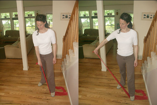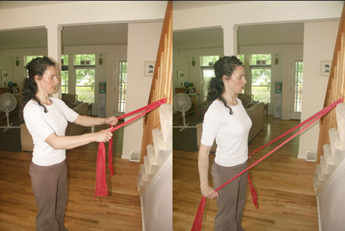 2. Внешнее вращение. Расположите руку так же , как при внутреннем вращении . Локоть держите прижатым к боку. Тяните бинт от себя, держа локоть согнутым под углом 90 градусов. Выдавите лопатку по направлению к позвоночнику в то время как тянете бинт от себя. Медленно вернитесь на исходную позицию. Сделайте три подхода по десять раз.