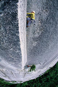 Маршрут, первозданная тридцатиметровая щель под пальцы, которая аккуратно рассекает гладкую нависающую гранитную поверхность, исходно был вспомогательным маршрутом Peter Croft ’а категории A2. Trotter предпринял 30-40 попыток перед тем, как достиг успеха, который пришел к нему вчера, когда 27-летний скалолаз вылез маршрут, закладывая все железо по мере прохождения.