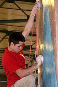 Лично я тренируюсь с командой только 1 раз в неделю. Так получается. В основном я лазаю с Мишей Солдатовым. Лазаем не особо трудные боулдеринги, не напрягаясь. А когда собираемся всем клубом, то получается сильная тренировка - с жесткими трассами. Схема такая - кто-нибудь придумывает трассу и по очереди пробуем её. Потом следующая трасса и т.д. Это, во-первых, интересно, во-вторых, если у кого-то не получается движение или какой-то участок - то подсказываем друг другу.