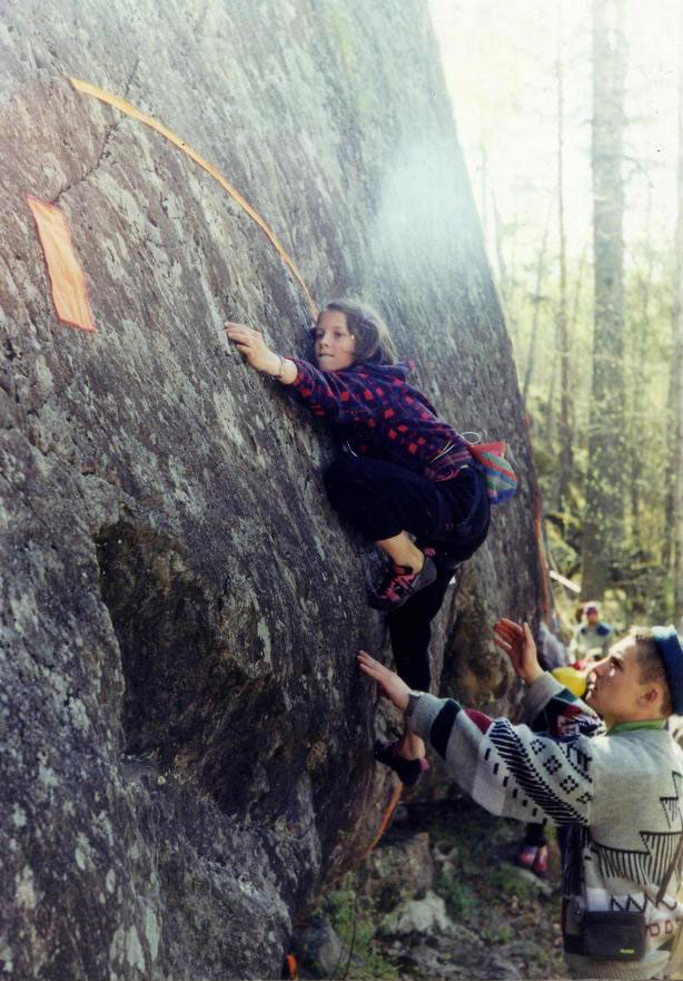 Давным-давно, во времена, когда Землю населяли саблезубые зайцы..:) Короче на скалы я впервые попала, когда мне было года полтора. Тут всё ясно: родители сами лазают, так что яблоко от ёлки недалеко падает. Лазала я, такой шкет, летом по скалам и всем попадающимся на глаза камушкам, а потом, когда мне стукнуло восемь, родители отдали в руки тренера и пошло-поехало..)