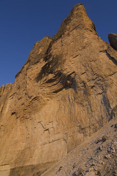 Начало маршрута, там где он совпадает в маршрутом Bellavista, пробито крючьями, а на двух веревках новой линии по гигантскому карнизу имеется 11 шлямбуров, так что закладки и френды можно оставить дома. Таким образом “Pan Aroma” можно считать интересным вызывающим мульипитчем, со сложностью порядка 8с.