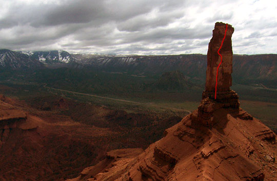 Маршрут The North Face (5.11a, 3 «веревки», 375'), Castleton Tower, Castle Valley, Utah. Steph Davis прошла этот маршрут свободным соло 4 мая 2008-го года, завершив восхождение прыжком с парашютом. Davis сказала, что «применила ту же систему, что и при восхождении на Diamond, Longs Peak, Rocky Mountain National Park, Colorado», и что психологическая подготовка играла большую роль нежели физическая. Автор: Chris Alstrin