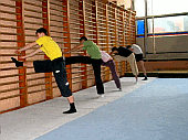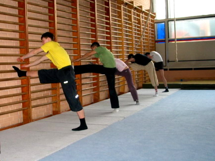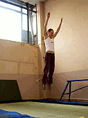 Мы начали занятия на базе кафедры гимнастики РГУФК. Поначалу все казалось нам слишком простым, нам показывали различные несложные упражнения на растяжку, координацию, воспитание силы. Много прыгали на батуте. Теперь учимся делать сальто и фляг. После нескольких занятий тренер взялся за нас значительно серьезней: контроль уровня ОФП, много растяжки, довольно большие нагрузки. Эти гимнасты уж очень здоровые ребята. Заниматься ходим с огромным удовольствием, все-таки разнообразные нагрузки значительно интереснее. Я надеюсь, что занятия гимнастикой помогут поднять мой уровень координации, укрепить все мышцы тела и привнести нечто новое в технику лазания.