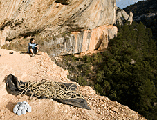 В общем, рассказываю подробно: я покинула Rodellar прежде чем дождь промочил всё. Я задержалась на несколько дней, и затем отправилась прямо на скалы Las Ventanas попробовать онсайт на Botanics (8b+) (для некоторых 8b/+), довольно близко к известному маршруту Pata Negra (8c), который я вылезла три года назад. Я знакома с таким стилем лазания: более силовым, чем можно себе представить. Большая часть маршрута это огромный карниз, к счастью, с не слишком маленькими зацепками. Я стартовала, полная сил, и там была большая колонна, ноги приходилось упирать в нее, но и этого приходилось избегать, так как она была слишком мокрой. После небольшого карниза, который отделял верхнюю часть, пришлось сильно нагружать предплечья, и закругляющийся рельеф не позволял мне полностью восстанавливать силы. Это меня по настоящему беспокоило. Я ушла с маленького карниза, попыталась зацепиться пяткой за что-нибудь, и уже добралась до каких-то покатых зацепок, когда мои ноги болтались в воздухе. Этот момент просто убил меня; я не могла зацепиться хоть за что-нибудь достаточно большое, чтобы избавиться от отчаяния и негативного мышления. Я была на последнем шлямбуре, я не могла вщелкнуть его, и мои силы заканчивались.
