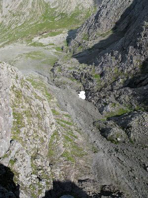 2. 70 метров напряженного лазания по нависающему желобу с ключом в конце. Тяжелая боулдеринговая проблема с плохой страховкой ведет к потолку и к отдыху вверх тормашками. ( плохо положенный камалот №6). Выход налево через потолок с ужасным лазанием вверх по стене прямо по острому гребню к спасению (топорик и скайхук в ненадежной скале). Налево к гребню, после чего следует несколько очень серьезных перехватов вверх к хорошему выступу и разумной страховке. Далее более легкий участок вверх по гребню (с хорошим пролетом) к маленькой полочке (левой рукой вытяните веревку чтобы ослабить натяжение). Вверх по крутому наслоению пока не достигнете легкого места, далее короткое соло до Tower Ridge.
