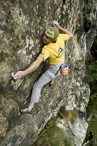 МакЛеод на первопроходе Metalcore (5.14c) в 2007-ом году, огромное нависание с дино-ключом на верху, Anvil Crag, Шотландия.