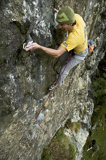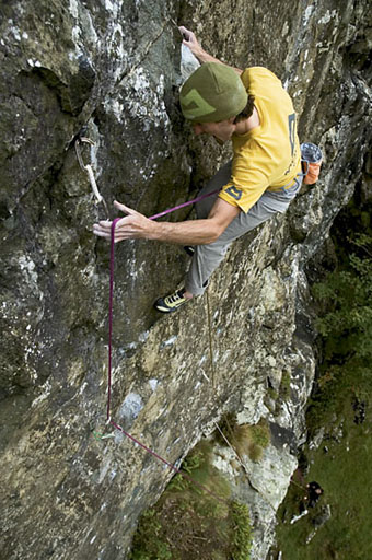 На втором прохождении маршрута Дэйва Биркетта "If 6 was 9" (E9 6c или 5.13c R/X), Iron Crag, Lake District, Англия; Сентябрь 2007.