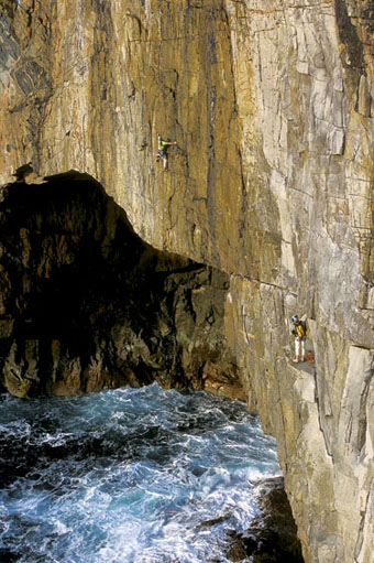 Дэйв МакЛеод (и Scott Muir) на Screaming Ab Dabs (E6 6b) на Isle of Lewis, Outer Hebrides, Шотландия. "Cubby" сделал первопроход этой линии в середине 80-ых . Фото Dave ‘Cubby’ Cuthbertson — cubbyimages.co.uk |
