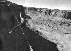 Крепкий, ростом 6 футов 5 дюймов и весом 180 фунтов, Поттер одет в джинсы и голубую майку с нарисованным ястребом. Широкая бандана удерживает непослушные волосы и делает его похожим на Кита Ричардса, только пониже ростом. Внешне - настоящий "Горный пофигист". Поттер делает первый шаг на веревку - тонкую голубую линию, переливающуюся на солнце, на фоне выжженного каньона с его ржавыми, желто-коричневыми стенами и растениями цвета меди. Пожалуй, он первый кто объединил два вида экстремального спорта: хайлайнинг и BASE-джампинг.