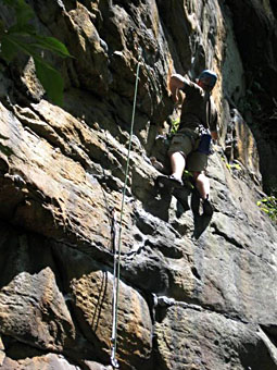Michael Manni долез до места отдыха на маршруте St. Pauli Girl (5.10c) в New River Gorge, в Западной Вирджинии. Он хотел лезть дальше не отдыхая, но я посоветовал ему остановиться, отдохнуть и оценить ситуацию. Прошло всего 9 месяцев с тех пор как Майк начал лазать 5.10, но было похоже, что выход на плато (период в развитии спортсмена, когда бурный рост спортивного мастерства замедляется или останавливается — прим. перев.) у Майка не за горами. Когда спортсмен выходит на плато это часто обескураживает и расстраивает, но Майк решил не замыкаться в себе, а наоборот прислушаться к советам окружающих и воспользоваться помощью тренера. Он услышал о Sport/Mental Camp (Лагерь физической и психологической подготовки — прим. перев.) в New River Gorge, где я преподавал, и решил записаться на занятия. Лазание Майка казалось несколько дёрганным и нервозным, как будто он хотел поскорее разделаться с лазанием. Его лазанию и тому, как он отдыхал между попытками, не хватало осознанности. Спешка казалась мне слабым звеном в его лазании, и я решил помочь ему справиться с проблемой.