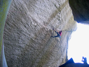 Подойдя под маршрут в этот раз, мне пришла в голову мысль изменить начало маршрута. Petit делал траверс по «карманам», чтобы добраться до «дино», если же стартовать «в лоб», то после лазания по участку из прекрасного вулканического туфа, попадешь под узкую стеночку, а уж после нее – под «дино». Так что я взял и пробил этот участок. И начал пробовать. Честно говоря я не испытывал каких-то особых чувств к этой "линии". Просто хотелось попробовать новый маршрут на хорошей стене. В итоге получился классический маршрут полный восхитительных движений. Он уникален; не на многих маршрутах есть такие «джампы» и даже подобие «дино» автоматически делает маршрут классикой.