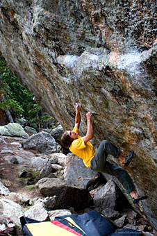 Прямо из постели, первая попытка за день, я выдерживаю прыжок, считаю, что проблема уже в кармане, но падаю на последнем тяжелом перехвате, с захвата пяткой. Я был шокирован и обескуражен, но предпринял вторую попытку. И снова упал в том же месте через пару попыток. Меня это здорово расстроило. Кожа на пальцах горела, и не знал, сколько еще попыток смогу выдержать. «Нет никакой причины, почему бы тебе не сделать это прямо сейчас», сказал я себе. Я сделал над собой усилие и вылез проблему с предельным напряжением во всем теле. На этот раз я не собирался падать.