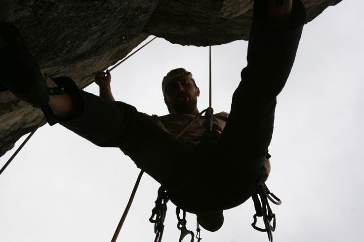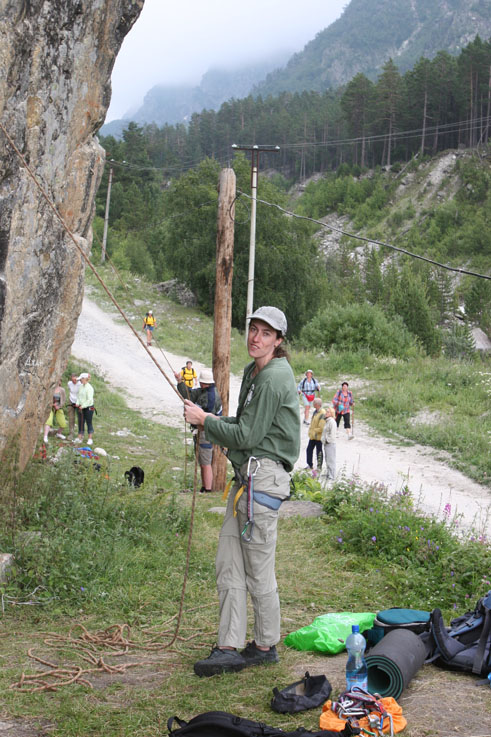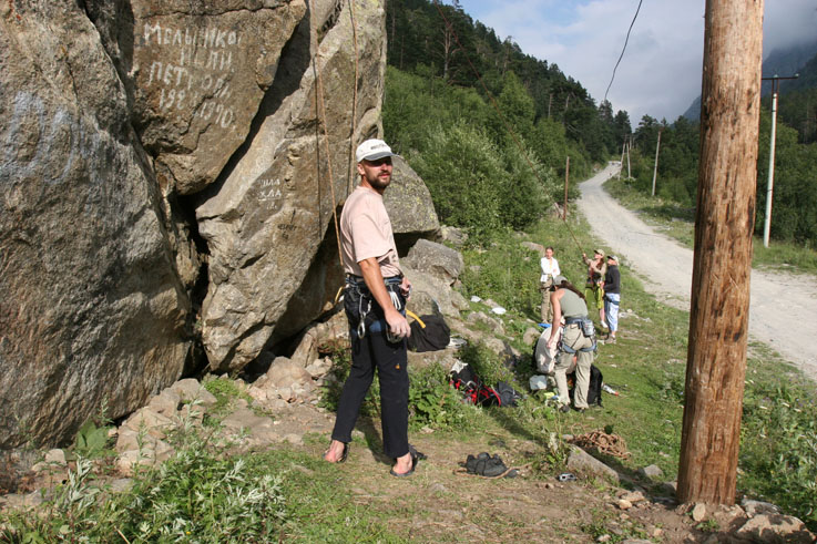 На следующий день пошли на скальную лабораторию (некоторое количество скал, расположенных над лагерем). На подходах группа восходителей отделалась лёгким испугом и потянутой ногой. Часть народа лазало по скалам, а я, Андрюха и Даня изображали trad восхождение вокруг скалы. В процессе восхождения перематерились, но без потерь снаряжения и участников круговой trad-маршрут был удачно завершён, правда в конце верёвка застряла меж двух сходящихся камней и пришлось полазать немного free solo её доставая.