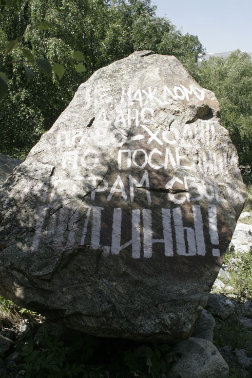 Двинулись в сторону Зелёной гостиницы, вскоре остановились на пограничном посту. Рядом с постом стоит камень с надписью сделанной не то пограничниками, не то кем-то из не допущенных в погранзону: «Не всякий гражданин имеет право ходить по последним метрам своей Родины». Проверка документов прошла довольно легко. И вот уже минут через 70 мы на Зелёной гостинице.