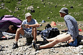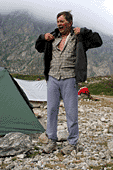 Дальше была какая-то малопонятная и малоприятная полудетективная история, в результате которой С.Б. Сарапаев не смог больше совершать с нами восхождения и нам (мне, Дане и Андрюхе) пришлось искать инструктора, который бы сходил с нами на 2A и 2B. Помимо этого надо было ещё зарегистрировать наши новые восхождения в КСП, купить газовые баллоны для горелки (примус решили из экономии веса не брать, да и воняет он, так что нафиг-нафиг), еду (так как из-за упомянутой выше детективной истории в столовой еду уже получить было нельзя), написать бумагу, что мы уходим из лагеря по собственной инициативе и в нашей смерти просим ни кого не винить, но самой большой проблемой оказался инструктор, точнее его отсутствие. Мы искали инструктора и на КСП и на поляне около Джантугана, строили планы по переезду в альплагерь Уллутау с целью поиска инструктора. Спасение пришло из альплагеря Эльбрус, куда с нашей просьбой мы заходили накануне и где проходили сборы краснодарской федерации альпинизма.
