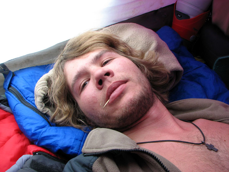 Под вечер на Зелёную прибыли маишники в составе трёх мужиков и девушки. Весь вечер что-то пили и о чём-то пели, песнопения время от времени прерывались троекратным «Жахнем! Жахнем! Жахнем!» и последующим возлиянием. Раньше я думал, что цитата из «Сказки о тройке» Стругацких: «Хуже всего, - рассказывал Федя. - это альпинисты с гитарами. Вы не можете себе представить, как это страшно, Эдик, когда в ваших родных диких горах, где шумят одни лишь обвалы, да и то в известное заранее время, вдруг над ухом кто-то зазвенит, застучит и примется реветь... », - это такая шутка юмора, теперь я понимаю что иногда эта цитата – суровая реальность. Ближе к полуночи кто-то из «Жахальщиков» громко, чтобы все окружающие слышали, крикнул: «Ну и что, что мы на Ушбу не взошли!». Тут в голове у меня пронеслась мысль: мало ли кто куда не взошёл (я, например на Эверест не взошёл), гораздо важнее, кто куда взошёл, на этой интересной мысли меня окончательно сморил сон. Во сне горные козлы с пецлевскими фонариками на рогах кружили вокруг палатки, цепляясь за её оттяжки, периодически они останавливались, кричали: «Жахнем! Жахнем! Жахнем!», - и продолжали кружить вокруг палатки, позванивая копытами о посуду. От этого ночного кошмара меня пробудил сработавший на чьём-то мобильнике будильник – пора вставать и готовить завтрак – мы сегодня дежурные и восходители заодно. Одевая спросонья носок, случайно наступил им в разбросанную ночью «козлами» кашу. Пришлось идти в разных носках.