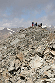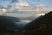 Дошли до лагеря. Сушить трусы не надо – хорошо. Собираем лагерь. В процессе сборки наблюдаем следующую картину - при подходе к перевалу Гумачи на группу человек из двадцати покатилась огромная глыба, размеры её были настолько велики, что казалось, что всё происходит не на самом деле и смотришь какие-то комбинированные съёмки в старом фильме про встречу команды Одиссея с циклопом. Народ пытается разбежаться в разные стороны, но это не очень получается - все связаны верёвкой. По счастью в последний момент глыба остановилась, словно о чём-то раздумывая, и слегка изменив направление, прокатилась сзади последнего в связке. От сердца отлегло. Народ на леднике сбился в одну кучу, видимо, переживая произошедшее событие, постоял так минут 10 и пошёл дальше к перевалу. Время было где-то часов 15, поздновато ребята под ледопад подошли. Но на этот раз обошлось.