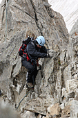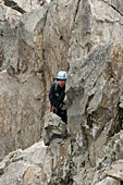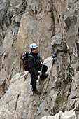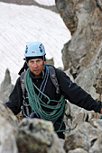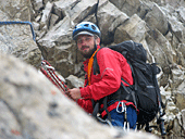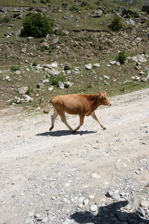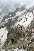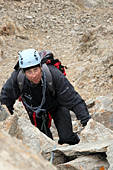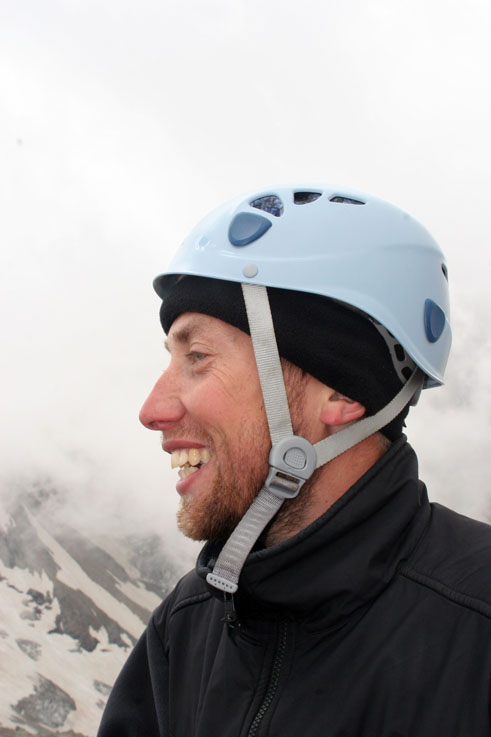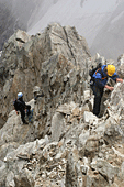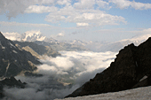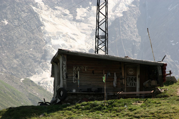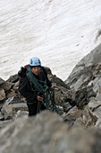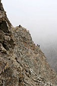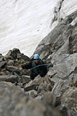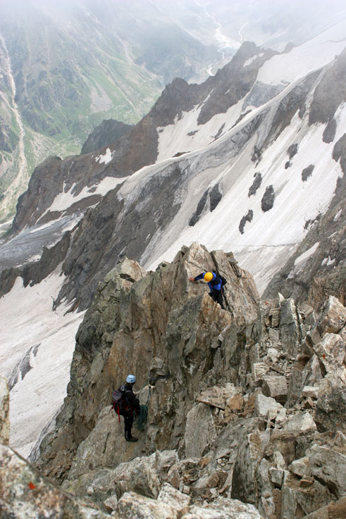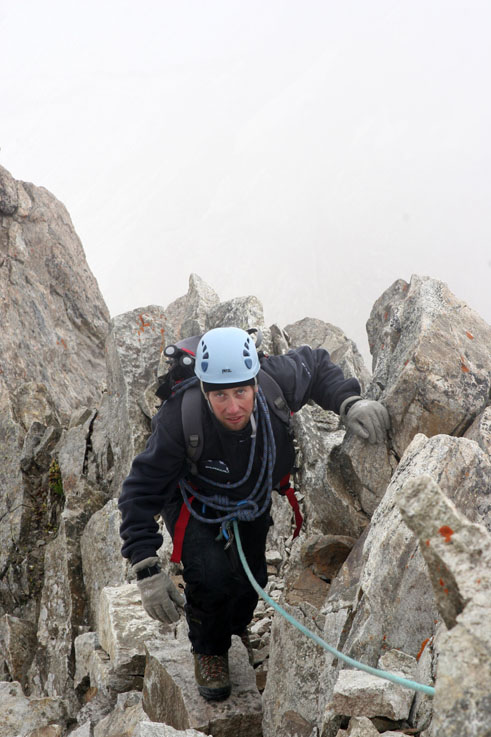 Часов в семь дождь окончательно стихает. Алексей Николаевич выглядывает из палатки: «Идём!». Я выбегаю, запускаю горелку, бужу Даню и Андрюху. Пытаюсь разглядеть лагерь Джантуган – не получается – всё, что ниже Зелёной гостиницы, закрыто облаками. Готовим кашу-чай идём. Я, помня о том, как плохо лазать в пластиках по скалам, одеваю свои трекинговые «саломоны», у которых внешняя обшивка от постоянного хождения по камням стала на мыске отделяться от подошвы так, что её уже никак не зашить. Идём по сыпухе, выходим на снежник, по нему выходим на гребень, по гребню иду первым, подходим к более крутым скалам. Даня вызывается лезть первым, отдаю ему своё железо.
