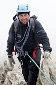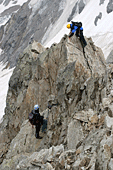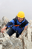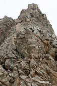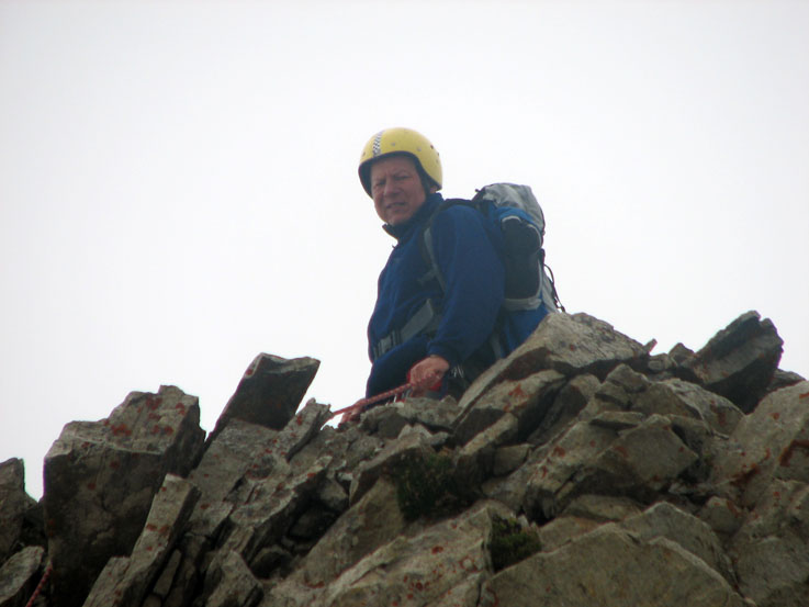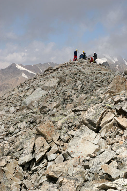 Даня, изображая противолодочный манёвр, ходит между камней на гребне галсами, в результате метров через двадцать верёвка перестала выдаваться в количестве, необходимом для продолжения восхождения. Отправляюсь со спасательной миссией – распутывать верёвку связки Даня-Андрюха. Верёвка распутана, Даня освобождён. Сижу – жду. Даня долезает до удобного места и организует станцию, принимает Андрюху. Ко мне подходит Алексей Николаевич – говорит: лезь до конца. Лезу, обгоняю связку Андрюха-Даня, вижу впереди большой камень, прирастающий к скале, а дальше можно до вершины пешком дотопать. Накидываю на камень петлю, делаю станцию, принимаю Алексея Николаевича. Он уходит на вершину, я маркирую верёвку и жду Даню с Андрюхой и смотрю, как по соседнему гребню с Ложного Койавгана по 2A подтягивается какая-то группа. Через некоторое время прибывают Андрюха с Даней. Идём на вершину, берём у прибывших раньше ребят записку, пишем свою, снизу по 1Б взбегают какие-то лоси из Житомира – ну и здоровы же. Фотографируемся и пытаемся скорее спуститься вниз, пока другие камней не наспускали.