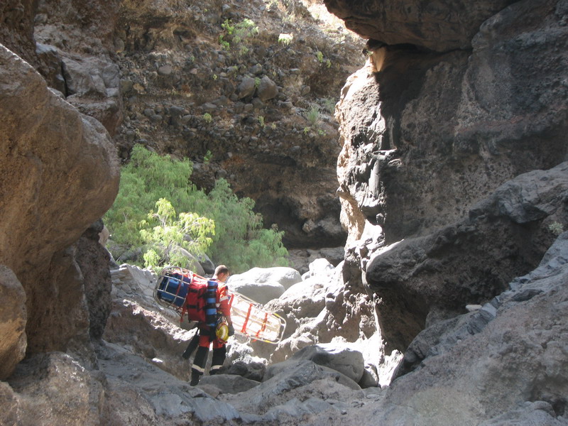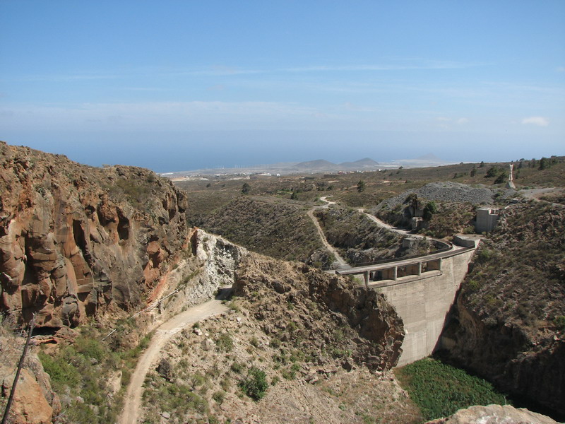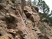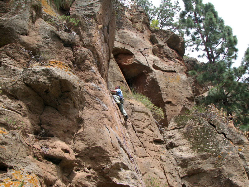 Для того чтобы в него попасть нужно от церкви, находящейся в поселке Эль Рио, подняться по узкой дороге пару километров вверх, затем по тропе, закрытой у дороги на цепь с замком, мимо одиноких ворот с левой стороны и глубокого водного резервуара, спуститься к, собственно, каньону. Если вы увидели внизу плотину, перекрывающую русло реки, то вы практически на месте. Теперь по ступенькам, сделанным прямо в скале, спускаетесь вниз и направо. И перед вами открывается первый створ уходящего вверх каньона. Сначала идут достаточно сильно нависающие скалы и первые два маршрута можно оценить как 7в. На фотографии видны следы магнезии и одинокая оттяжка – след досрочного бегства со скалы. Постепенно стены становятся вертикальными и в конце массива есть немного положительных маршрутов. Сложность самых простых маршрутов предположительно 6а – 6в. Потом стены постепенно превращались в склоны, и каньон в просматриваемой части заканчивался достаточно узким проходом, за которым не угадывалось ничего достойного внимания.