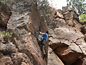 Слева от моста ущелье выглядит, с точки зрения скалолазания непривлекательно, но не делайте поспешных выводов. Если пройти вверх по ущелью, то можно найти десятки маршрутов высотой 15 – 20 м. Сложность от 5с до 7а. В выходные здесь бывает достаточно много народа. Мы видели как-то человек 15 – 20. Иногда появляются бойскауты, но на маршруты они не претендуют.