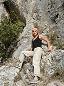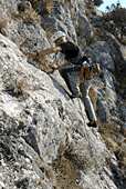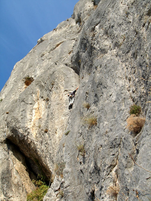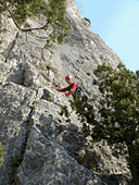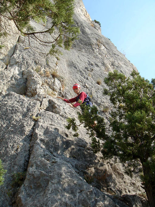 Все это в полной мере я успел оценить после начала движения – лезешь себе по такой наклонной полке, вешаешь петли на деревья, потом думаешь – ну его нафиг, петли сейчас кончатся, пойду вон закладку суну, вон там щель какая-то. Подходишь к щели – а она какая-то хреновая, идешь дальше, там еще чего-то, опять не подходит, ты опять идешь дальше – а потом смотришь вниз – а последняя точка осталась метрах в двадцати, озираешься, и думаешь, что уже надо чего-то куда-нибудь сунуть, суешь френд, заходишь за угол – а там шлямбур. Оцениваешь, что если щелкнуться в него – то веревку не протянешь, потому что френд чуть сбоку получается, и лезешь дальше.