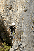 И вот я стартую. Маршрут начинается по здоровенной щели, через некоторое время приходится лезть без дураков, 6 a, может быть, даже с плюсом, лезть надо отнюдь не 30 метров. Ключ очень прикольный – надо забиться целиком в наклонную щель, и извиваясь, как червяк, распираясь всем, чем только можно, продвигаться наверх. Тянется щель наверх 70 метров, оканчивается второй станцией под бастионом «Лапа». В этом месте от маршрута отходит направо вариант «Лапа Справа», куда мы и отправились после слов Сенсея, который утверждал, что на классике нам скучно будет. Да, не соскучились...