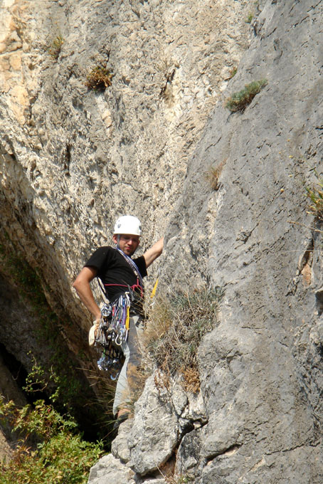 На второй веревке началось уже лазание – нависающая щель, все по взрослому. Запомнилось, как я сидел на полке, изучая описание, а Сава с соседнего мультипитча кричал – Игорь, тебе выше, станция рядом! Далее все воспоминания сливаются в монотонный процесс – лезешь, делаешь станцию, выбираешь, страхуешь. В памяти всплывают лишь яркие кусочки. Болдеринг на шлямбурной дороге – отличные там шлямбура, судя по всему, сделаны из корпуса трофейной фашистской подлодки в голодные послевоенные времена. Представьте себе нечто такое покрытое хлопьями ржавчины, которое болтается, поскрипывая на ветру, на подозрительного вида гвоздике. В общем, мое свежезаборотое очко на этом месте не выдержало и я от души поитошил – встал на болт и взялся за оттяжку. Вообще, шлямбурные дороги сильно портят впечатление от маршрута, увы. После шлямбурной дороги мы непонятным образом сориентировались и вырулили в пещеру. Пещера отличная, домашнего такого вида. В общем, если кому нужно будет совсем недорогое жилье в Крыму – рекомендую, сверху аккурат полтинник дюльфера. Причем у нас сложилось такое ощущение, что эта мысль посетила нас отнюдь не первых.
