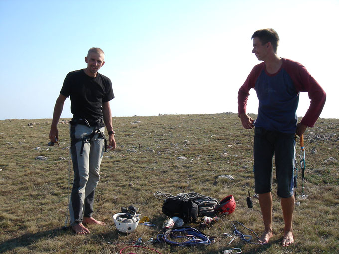 Пока мы сидели в пещере, сверху прилетела веревка, по ней сдюльферял парень и осведомился, не находили ли мы на этом маршруте новенький блестящий карабин? Увы и ах, карабина мы не находили, видать, кто-то его снял до нас. Пообщавшись с нами, парень встегнул жумар и убыл наверх, ну а я отправился наверх – по нависающей щели ужасного вида. По пути взялся за дюльферную петлю, подтянулся и увидел, что она перетерлась до непотребного состояния и висит на двух ниточках. В общем, ито – это зло, да здравствует свободное лазание. На выходе из щели я в полной мере ощутил всю прелесть карниза «Семерка» - веревка не протягивается вообще никак, ее приходится вытягивать ногами, при этом ощущаешь, что обвязка медленно, но верно сползает с тела. А что я испытывал на станции, выбирая веревку – не описать ничем. Шульц, придя на станцию, пожурил мне – чего ты матерился на весь ЮБК, я все время давал достаточно веревки. Мне было стыдно. Камрады, если пойдете туда – вешайте счетверенные оттяжки, наращивайте их петлями, а то будет вам тухло. Выход на яйлу – отличный, в лучших традициях Канта – берешься за край, оп – и ты уже наверху, никакой крыши.