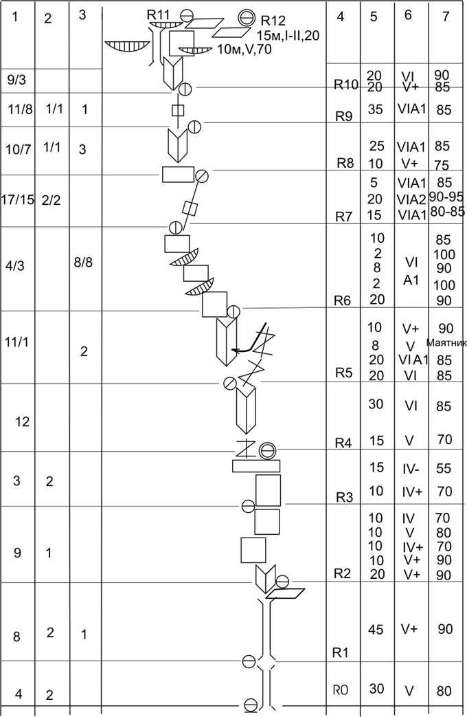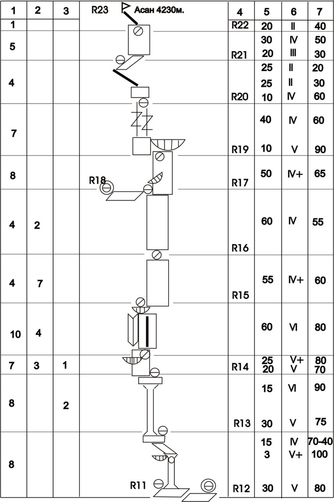 R 12- R 16: Верхняя часть стены. По системе каминов до небольшой полочки, от которой вверх влево под нависание. Лазание сложное, страховка френды, крупные стопера. Из под нависания вправо вверх , далее вертикально вверх слева от не ярко выраженного ребра под нависающий блок страховка в основном на якорных крючьях. Обойдя блок справа выйти на «крышу».