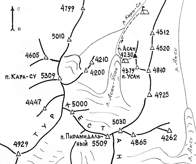 От базового лагеря в долине реки Кара-Су идти вверх по левому берегу по ходу движения. Сначала по тропе, потом по боковой морене ледника до осыпи из белых камней. Налево по верху осыпи до скальной стенки. Лазание средней сложности 20 метров вверх по плитам, затем вверх вправо по крутому осыпному склону под правую часть СЗ стены в.Асан. Ночевка непосредственно под началом маршрута Тимофеева.